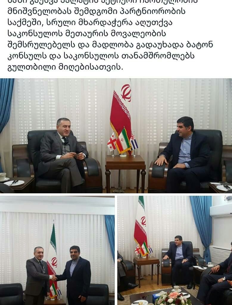 آقای نیکا چخارتیشویلی رییس جدید اتاق آجارا روز سه شنبه 12 آذر 1398 با آقای احمد بادپا سرکنسول ایران در باتومی در محل نمایندگی دیدار نمود.
