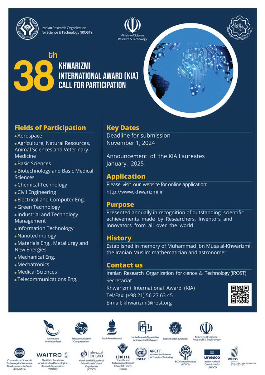 سازمان پژوهشهای علمی و صنعتی ایران وابسته به وزارت علوم، تحقیقات و فناوری، آغاز ثبت نام سی و هشتمین جشنواره بین المللی و سومین جشنواره نوآوری و فناوری خوارزمی، را اعلام نمود. براساس این اطلاعیه مهلت ثبت نام تا پایان مرداد ماه سال جاری میباشد. زمینههای علمی مورد پذیرش در جشنوارهها شامل فناوریهای شیمیایی، مهندسی مکانیک، مهندسی برق و کامپیوتر، هنر، معماری و شهرسازی، مدیریت آب، کشاورزی و منابع طبیعی، علوم پایه، مهندسی عمران، صنایع پیشرفته و مدیریت هوشمند فناوری، مواد، متالورژی و انرژیهای نو، زیست فناوری و علوم پایه پزشکی، محیط زیست، فناورینانو، مهندسی هوافضا، مهندسی نرم افزار و فناوری اطلاعات، مهندسی مکاترونیک، مهندسی مخابرات و هوش مصنوعی و کوانتوم میباشد.